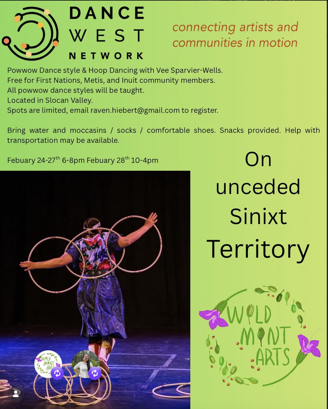 In late February 2026, Artist Vee Sparvier-Wells of Wild Mint Arts will offer classes in Hoop Dance and Powwow to Indigenous community members of all ages.