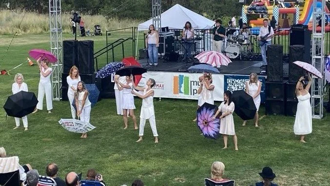Community dancers , led by CDC Claudia Moore, bring joy to Kelowna audiences at Music in the Park, July 2025!