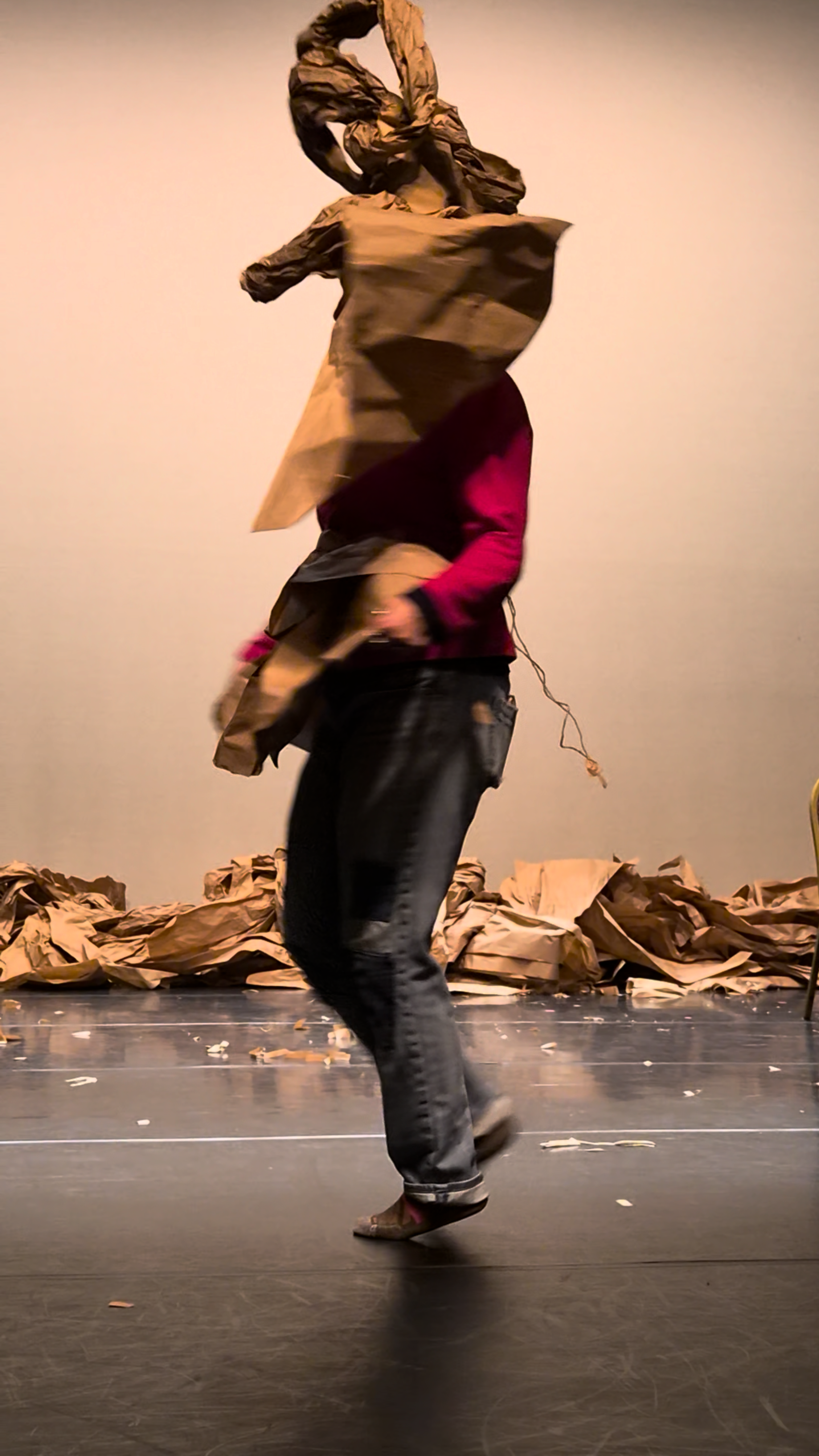 Central to this work is the materiality and structure of a garment constructed entirely out of paper, which is created new each time the work is performed.
