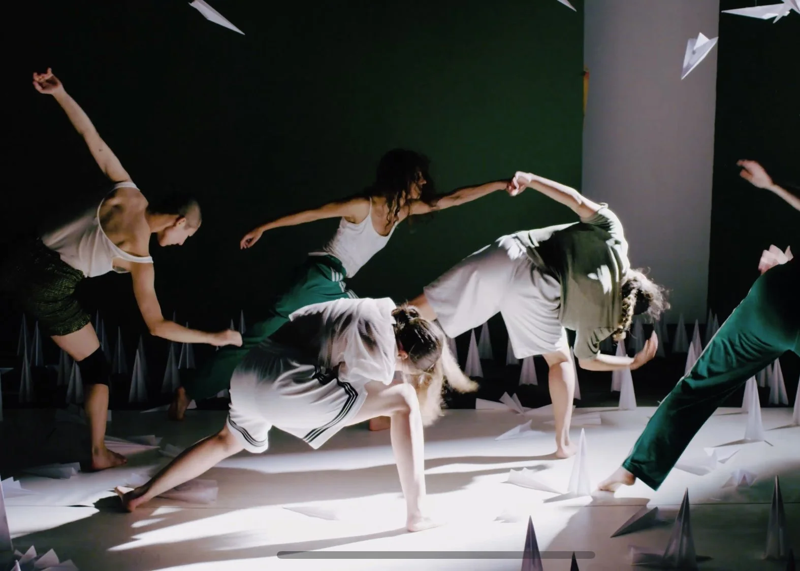 'Paper Mountains' is a work that explores how we hold memory through movement. The piece uses choreography created during many months in solitude, and translates that movement on to other bodies, spaces, and paper planes, to describe a fragmented story of loneliness, desire, and rage.