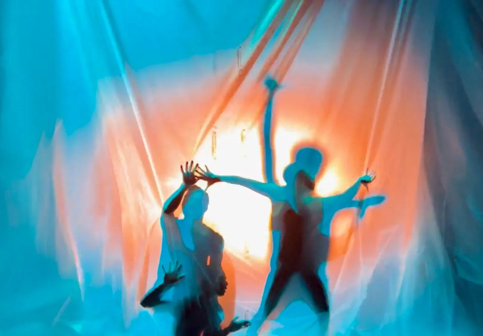 In the second act, the climate crisis, or “death”, has arrived at the party. Projections surround the audience with images of forest fires, floods, landfills, mines, and overcrowding. Lifeless bodies are suspended, suffocated in the material of their own making, and the final dance is one of mourning and loss. Red evokes a cathartic experience through examining our collective guilt and repressed fears for the future.